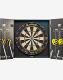This premium set boasts a signature player-endorsed dartboard housed within an elegant cabinet. The dartboard features a rotational score-ring, ultra-thin wire system, and staple-free bullseye for precise and rewarding gameplay. Crafted from self-healing African Sisal material, it ensures durability and shape recovery for extended use.