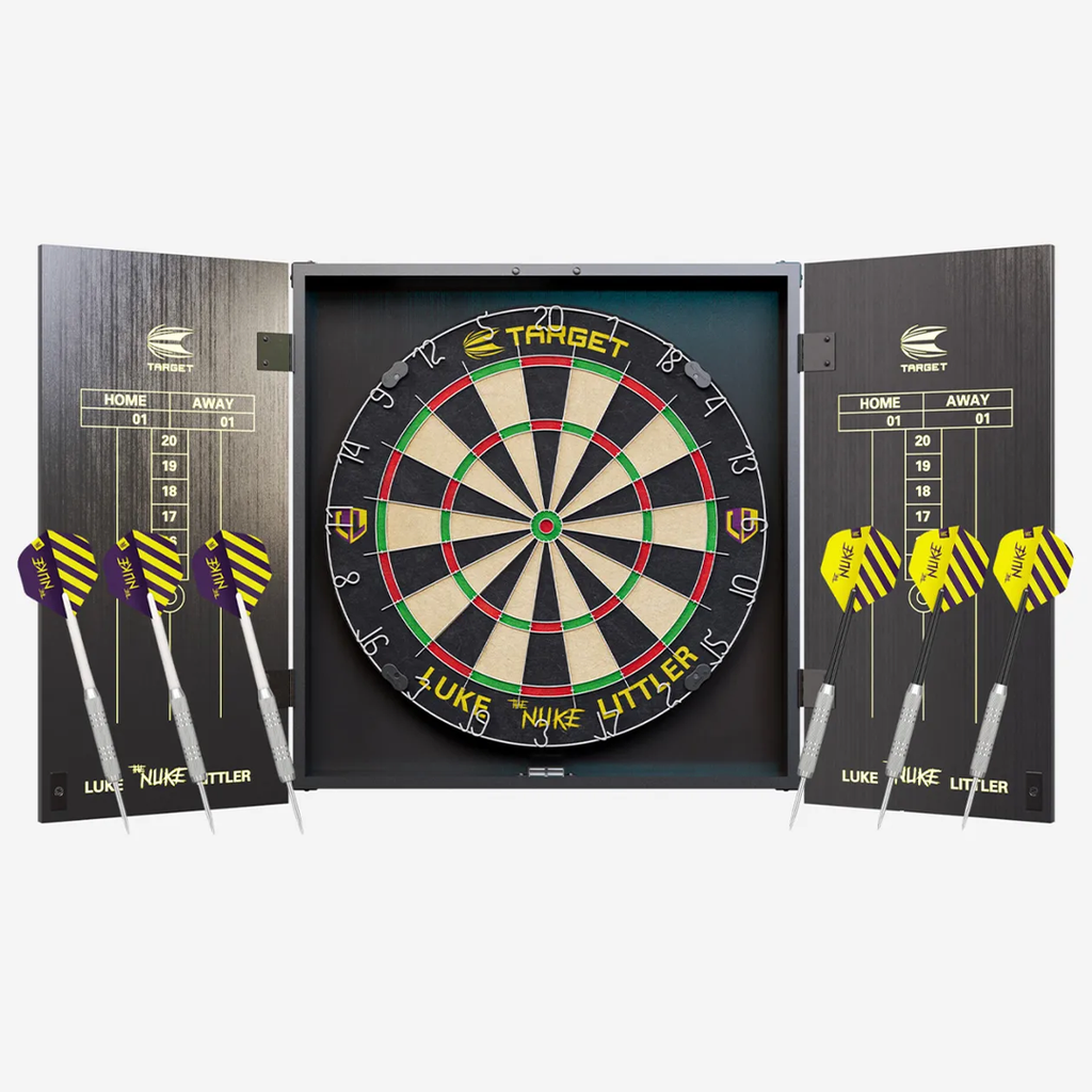 Introducing the Luke Littler Dartboard Cabinet Set, a collaboration with the renowned darting sensation, "The Nuke".