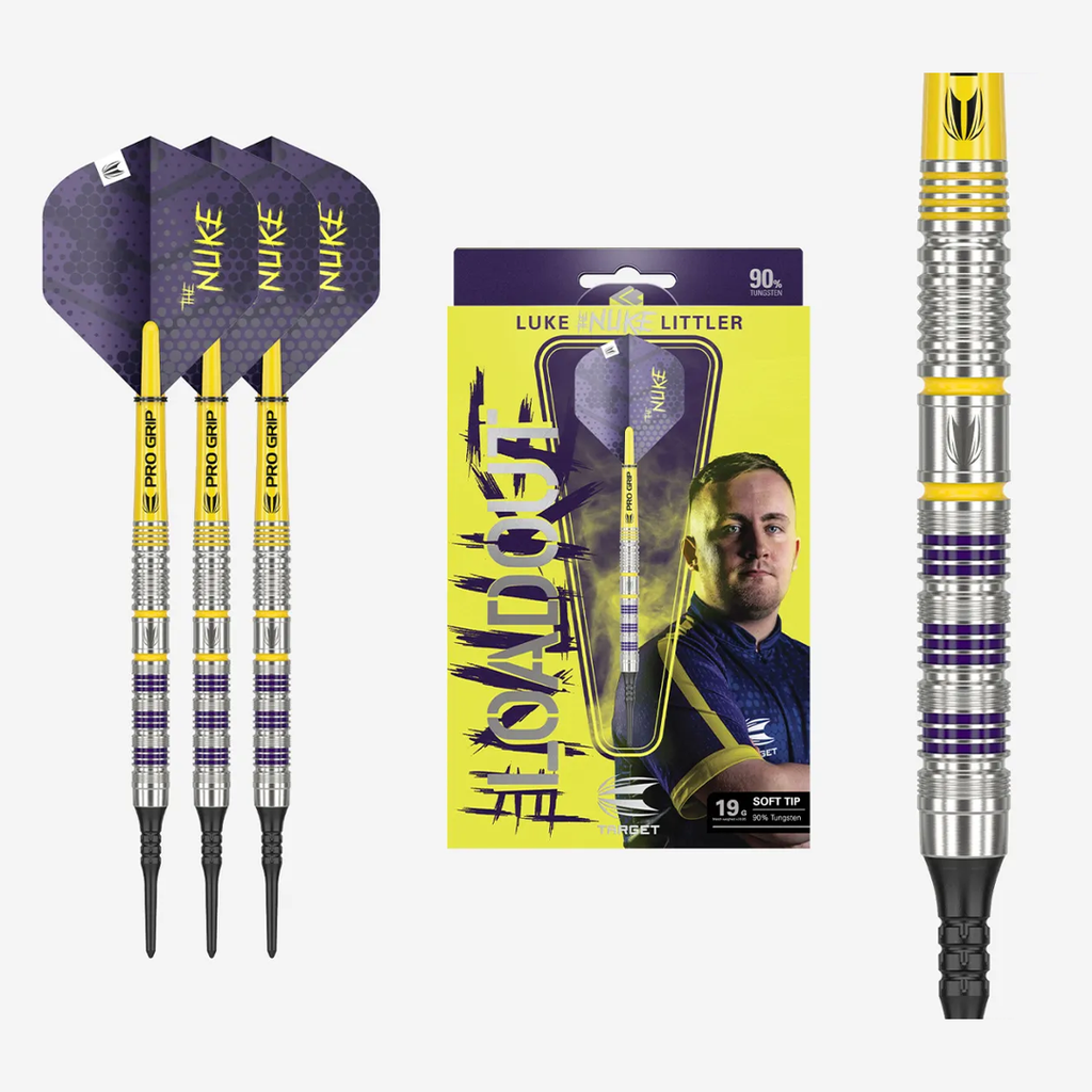 Introducing the Luke Littler Loadout Soft Tip Darts, a collaborative design with the 2024 PDC World Championship finalist. The dart set includes a 90% Tungsten straight barrel 47mm in length and a diameter of 6.3mm, featuring r...